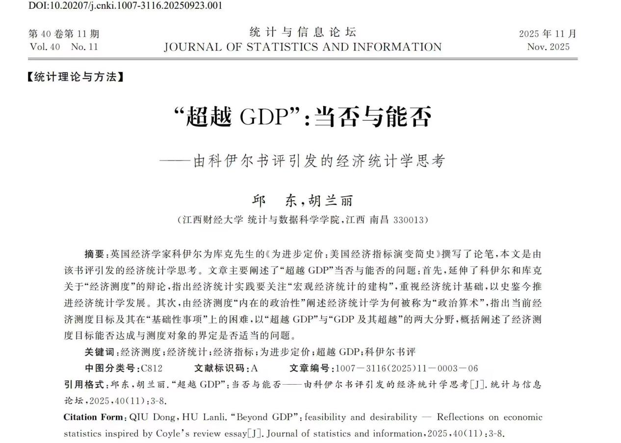 我校讲席教授,统计与数据科学学院名誉院长,国势研究院院长邱东与国势研究院副院长胡兰丽博士合作撰写的论文《“超越GDP”:当否与能否——由科伊尔书评引发的经济统计学思考》,已于《统计与信息论坛》2025年第11期正式发表。文章以英国经济学家戴安娜·科伊尔对伊莱·库克《为进步定价:美国经济指标演变简史》所作书评为切入点,对“超越GDP”思潮进行了系统性的学理反思。