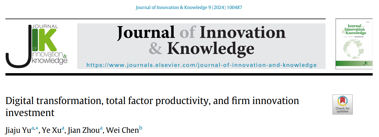 统计学院青年教师喻家驹以第一作者、通讯作者身份撰写的文章《Digital transformation, total factor productivity, and firm innovation investment》被期刊《Journal of Innovation & Knowledge》接受发表。本期刊被SSCI收录,为JCRQ1期刊,2023年影响因子为15.6,系我校认定的权威B+类刊物。该文章为喻家驹老师主持的国家社科基金青年项目“新阶段人口红利对中国经济高质量发展影响的统计研究”和江西省社科基金青年项目“新阶段人口红利赋能江西经济高质量发展的实现路径研究”的阶段性成果,其指导的2022级应用统计专硕学生周健为合作者之一。