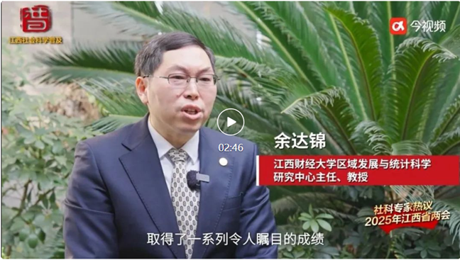 日前,江西省社科联携手江西广播电视台今视频策划摄制推出《社科专家热议2025年江西省两会》系列短视频。我校区域发展与统计科学研究中心主任、统计与数据科学学院教授余达锦受邀参加首期短视频热议,就江西省政府工作报告提出的相关重点工作积极提出意见建议,助力江西经济社会高质量发展。短视频报道通过今视频客户端首发后,还被“学习强国”学习平台、央视频客户端、人民日报客户端、江西社科、今日头条、百度、腾讯新闻、一点资讯、江西社科大讲堂等平台转载推送,视频播放超10万次,受广大网友一致好评,取得良好社会传播效果。