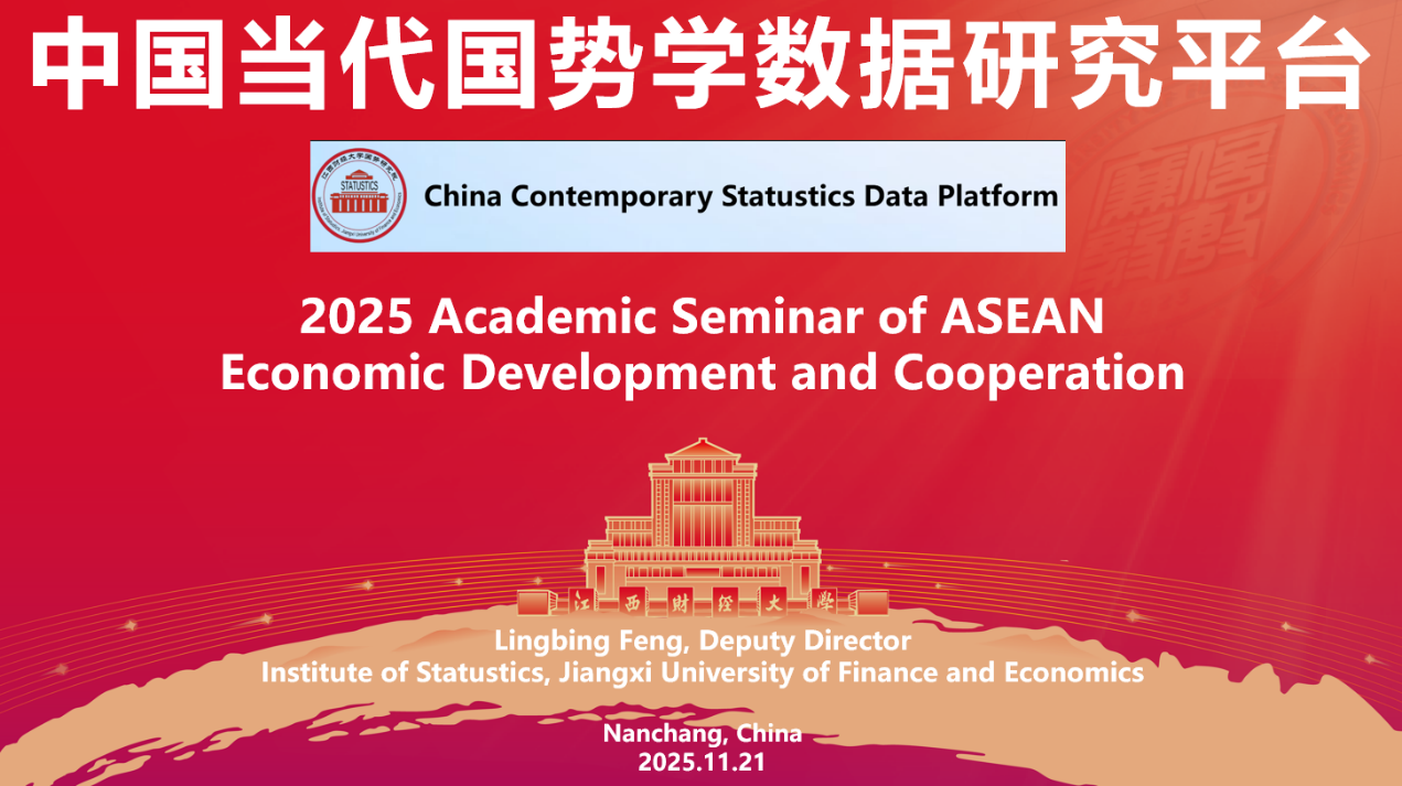由江西财经大学与亚洲研究与对话中心(Asian Integrative Studies and Dialogue Center)联合主办的“2025年东盟经济发展与合作学术研讨会”于2025年11月20日至22日在江西省南昌市文演建国饭店成功召开,活动的主题为“全球变局下中国—东盟区域合作的机遇与挑战”。来自中国、柬埔寨、菲律宾、老挝、印度尼西亚等多国政府机构、高校、智库及媒体的众多专家学者齐聚南昌,围绕多边贸易体制、区域基础设施建设、教育合作、媒体传播、国别战略等议题展开了深入研讨。统计与数据科学学院、国势研究院副院长冯凌秉应邀在会上作全英文主旨报告,主题为“中国当代国势学与数据研究平台”。