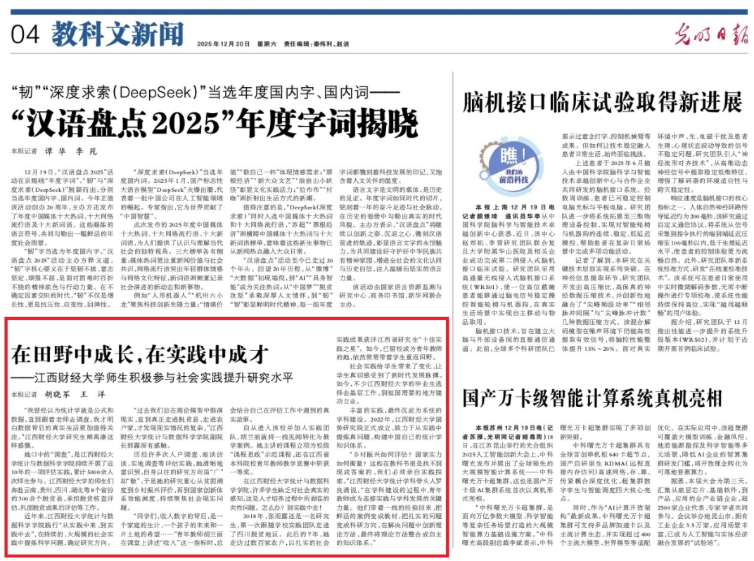 12月20日,《光明日报》教科文版报道了统计与数据科学学院师生积极投身社会实践,在实践锻炼中实现研究水平提升与个人成长的动人篇章。
