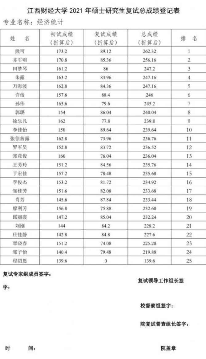 江西财经大学2021年硕士研究生复试总成绩登记表