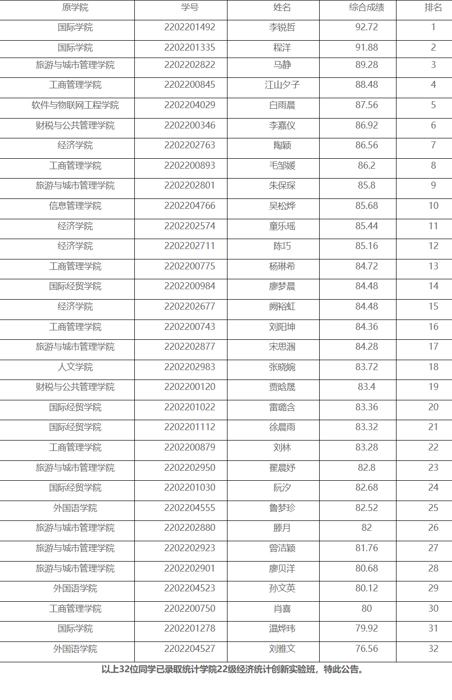 22级经济统计(创新实验班)录取名单