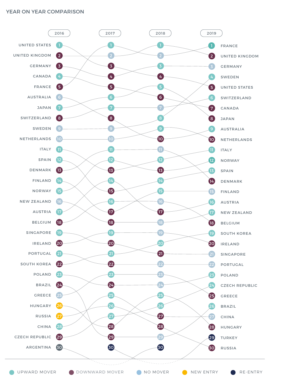 法国(第1位)展现了文化引领型软实力的成功路径。其排名从2016年第5位跃升至2017年和2019年的榜首,展现出显著上升势头。法国软实力优势源于其成功整合多元资源:全球最庞大的外交网络之一、独特文化遗产(米其林餐厅、法国菜入选联合国非遗)、国际标志性文化符号(埃菲尔铁塔、卢浮宫)以及具有全球影响力的文化活动(戛纳电影节、环法自行车赛)。