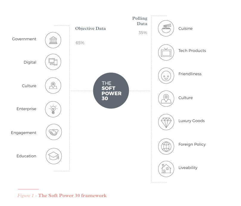 Soft Power 30指数采用了复合指数的设计思路,将每个国家的最终得分划分为两大组成部分:依据6个类别的客观数据(政府、数字、文化、企业、参与度、教育)与全球民意调查的结果按照一定比例相加得出。