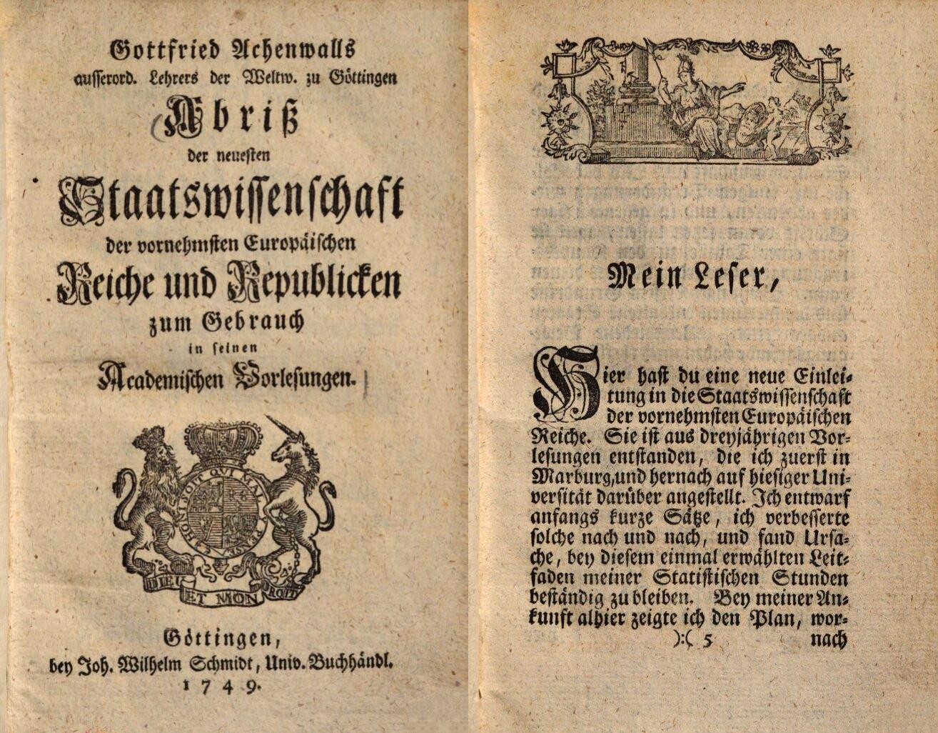 随着国势学的进一步发展,阿亨瓦尔在著作《近代欧洲各国国势学纲要》(《Abriß der neuesten Staatswissenschaft der vornehmen Europäischen Reiche und Republiken》中提出了以数据为基础的国势分类方法,强调通过比较不同国家的数据来揭示规律。在这本书的序言中第一次使用了“Statistik”使国势学成为了一门独立的学科[2],为国势学提供了量化分析的框架。同时,阿亨瓦尔继承了康令的比较法和记叙法[3],推动了系统化的国势描述。