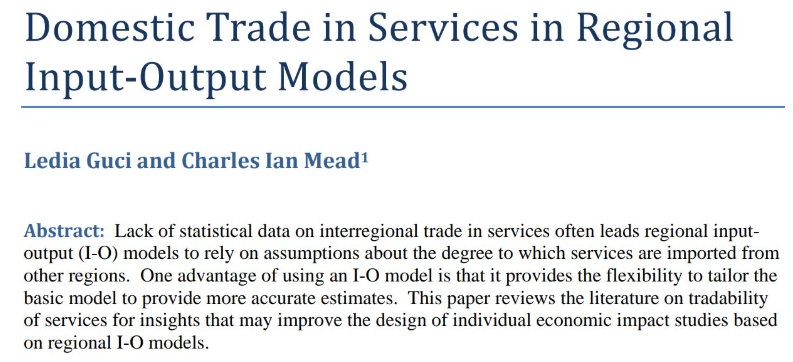 在全球价值链深度重构、数字技术快速演进的当下,服务“可不可贸易”已不再是纯学术命题,而是关乎区域政策、投资选址与就业估计的现实议题。传统区域投入产出(I-O)模型普遍假设“服务多由本地提供”,却缺乏系统的州际服务贸易统计,导致经济影响评估结果忽高忽低。美国商务部经济分析局(BEA)两位作者Guci与Mead的论文《Domestic Trade in Services in Regional Input-Output Models》正是针对这一缺口,系统梳理了“服务可否跨区贸易”的判定依据、量化指标与模型应用策略。下文分三章递进解读:第一章阐释服务在区域经济与I-O框架中的独特地位;第二章剖析决定服务可贸易性的三大维度与测度方法;第三章给出模型实操建议并评估不同指数的信度与局限。通过三重视角,读者可快速掌握如何“把服务贸易假设”从黑箱变成可验证、可调参、可更新的透明模块。