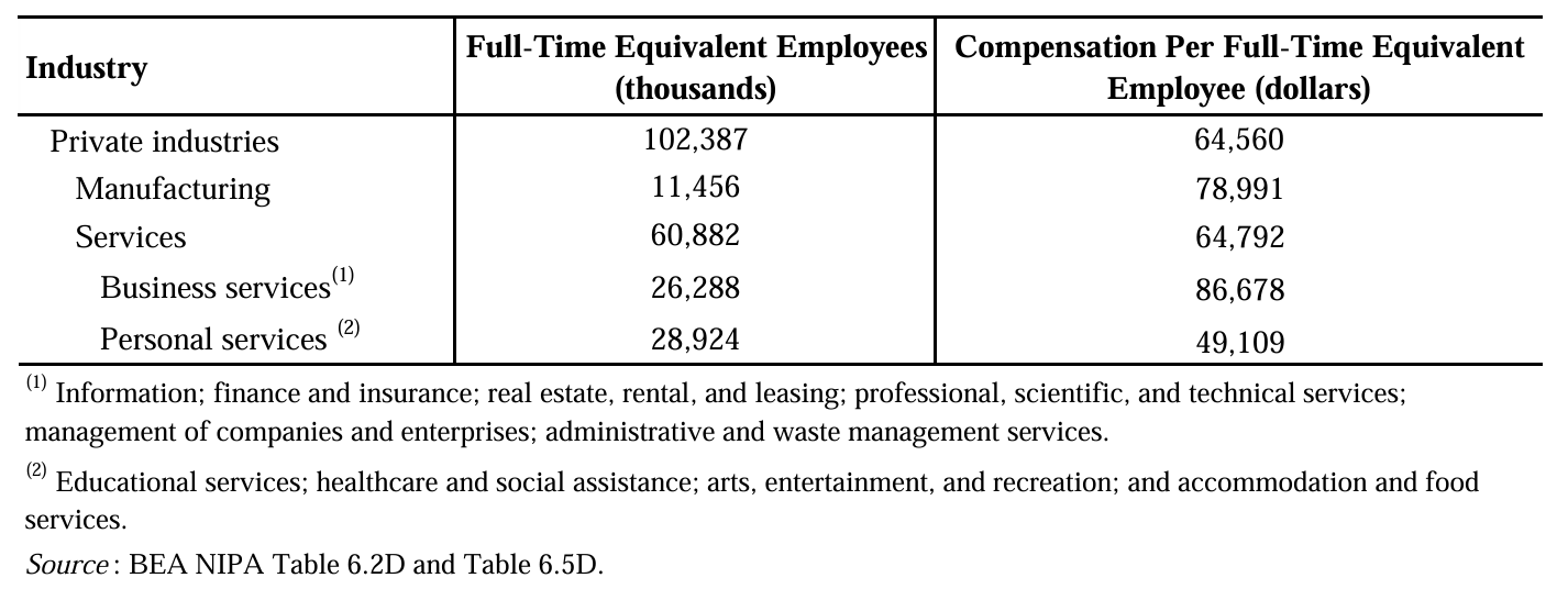 进入21世纪以来,美国服务业已不再是传统印象中的“消费末梢”,而是产值、就业与出口同步跃升的价值链枢纽。2000—2012年,私人服务生产部门年均增速4.1%,两倍于商品生产部门;2012年服务业占GDP近七成,占私人就业逾八成。其中高技能商业服务——信息、金融、专业科技、公司管理等——以2600多万全时当量就业和人均近8.7万美元的薪酬,全面超越制造业(见Table1),且其产出六成以上作为中间投入再次进入生产循环,彻底打破了“服务即终端消费”的旧叙事。