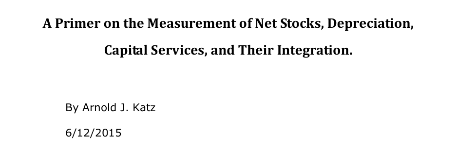 Katz, Arnold J. 2015. A Primer on the Measurement of Net Stocks, Depreciation, Capital Services, and Their Integration. BEA.